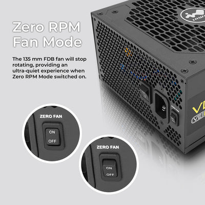 The VE Series features a smart temperature-controlled FDB fan with a zero RPM mode. To activate zero RPM mode, simply turn on the button. The FDB fan will stop turning, providing a quiet experience. When the temperature inside the PSU reaches 50°C, the PSU will automatically turn on the fan to dissipate heat. This ensures that the power supply remains stable and maintains low noise levels.